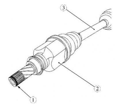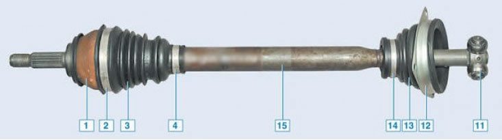 Левый привод автомобилей с КПП JH3: 1 - корпус наружного ШРУСа; 2 - большой хомут пыльника наружного ШРУСа; 3 - пыльник наружный; 4 - малый хомут пыльника наружного шарнира; 11 - трипод внутреннего ШРУСа; 12 - держатель чехла внутреннего ШРУСа привода левого колеса; 13 - пыльник внутреннего ШРУСа привода левого колеса; 14- хомут крепления пыльника внутреннего ШРУСа привода левого колеса; 15 - вал привода левого колеса