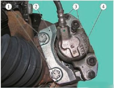Рисунок 12-2 - Снятие направляющей переднего тормоза: 1 - болты крепления направляющей переднего тормоза; 2 - направляющая переднего тормоза; 3 - болты крепления направляющих пальцев; 4 - суппорт