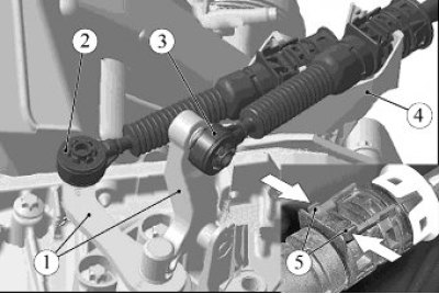 Сжать усики 5 фиксатора и извлечь тросы переключения передач из пазов кронштейна 4 крепления.