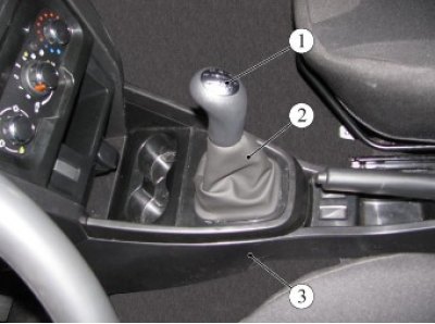Рисунок 4-2 - Снятие облицовки туннеля пола: 1 - рукоятка рычага переключения передач; 2 - чехол рычага переключения передач; 3 - облицовка туннеля пола