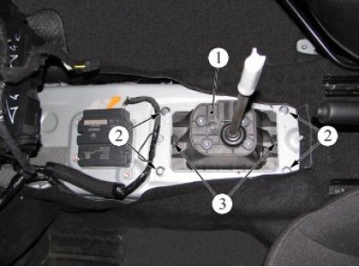 Нанести на сферические пальцы рычагов механизма 1 переключения передач на коробке передач смазку и подсоединить наконечники 2 и 3 тросов к рычагам (смазка АЗМОЛ ЛСЦ-15 согласно действующему "Кодификатору основных и вспомогательных материалов, применяемых при ТО и ремонте автомобилей LADA" К 3100.25100.00018, норма расхода 1 г).