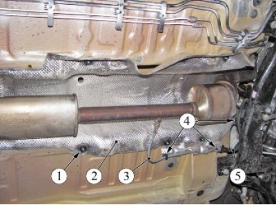 Рисунок 4-4 - Снятие переднего теплового экрана: 1 - гайка; 2 - экран тепловой передний; 3 - жгут проводов датчика кислорода; 4 - места крепления жгутов проводов; 5 - жгут проводов двигателя